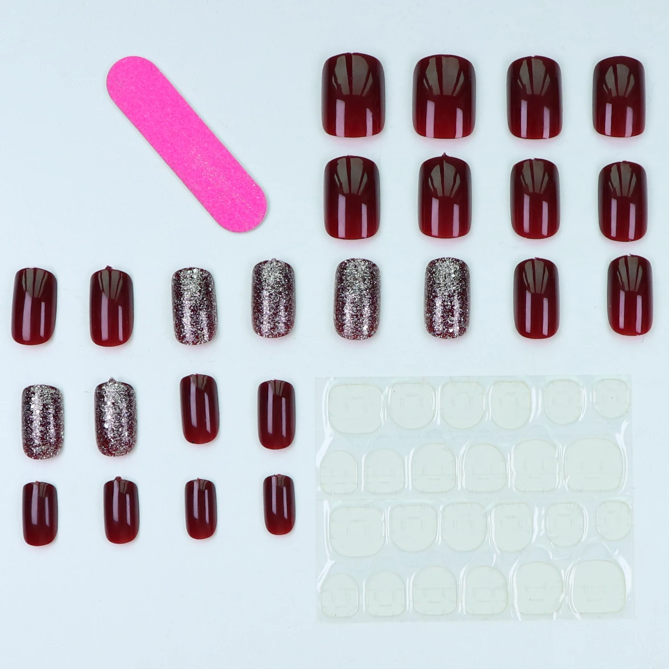 24PCS- wine red square fake nails, silver glitter inlay, exquisite elegance, fashion generous, suitable for dating, dinner