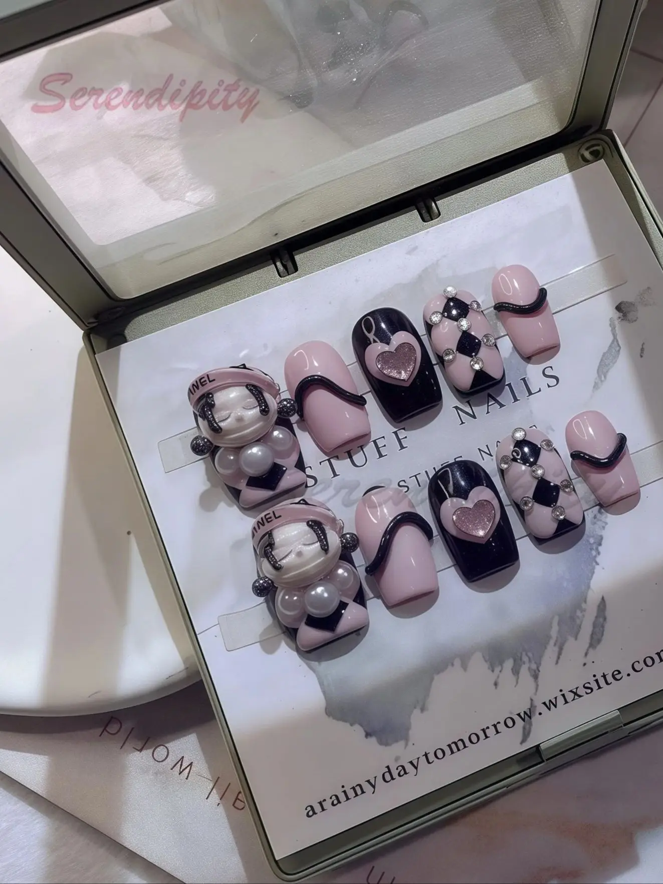 Blackpink Carved Doll Fake Nails Medium Trapezoidal Bubble Mart Press on Nails With Hand Drawn Lines Wearable Full Cover Nails